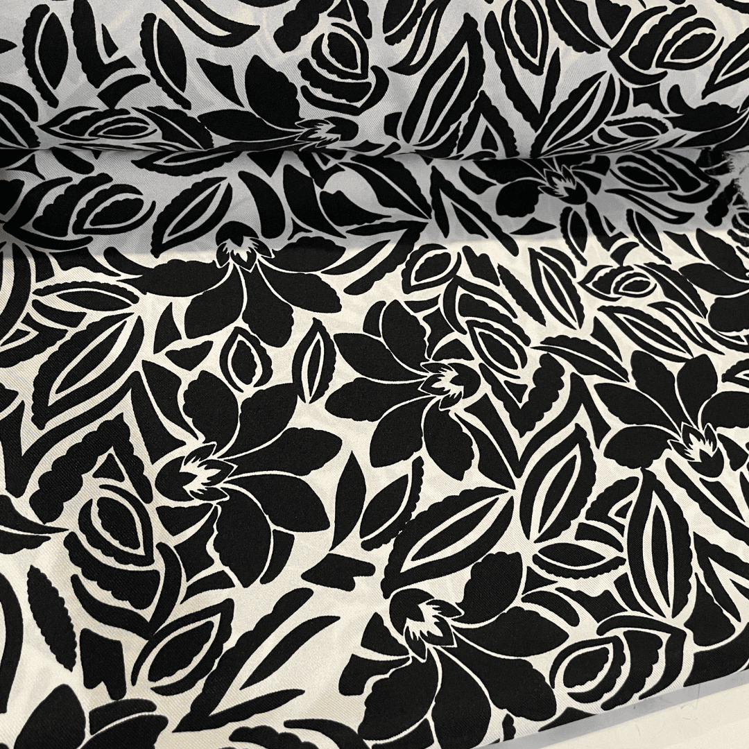 Tecido Crepe Sarjado Estampado - Floral Abstrato Preto e Branco - 1,50m de Largura | Textura Diagonal e Não Amassa